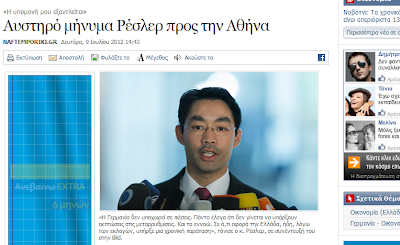 Αυτή τη φορά, φρόντισε να τηρήσει την… παράδοση ο… Βιετναμέζος υπ. Οικον. της Γερμανίας (!), Φίλιπ Ρέσλερ, ο οποίος «προέβλεψε» σύντομη έξοδο της Ελλάδος από την ευρωζώνη, προσθέτοντας πως η προοπτική αυτή δεν τρομάζει πλέον τους ομοίους του: